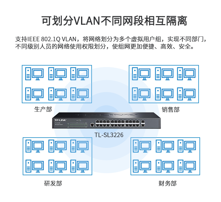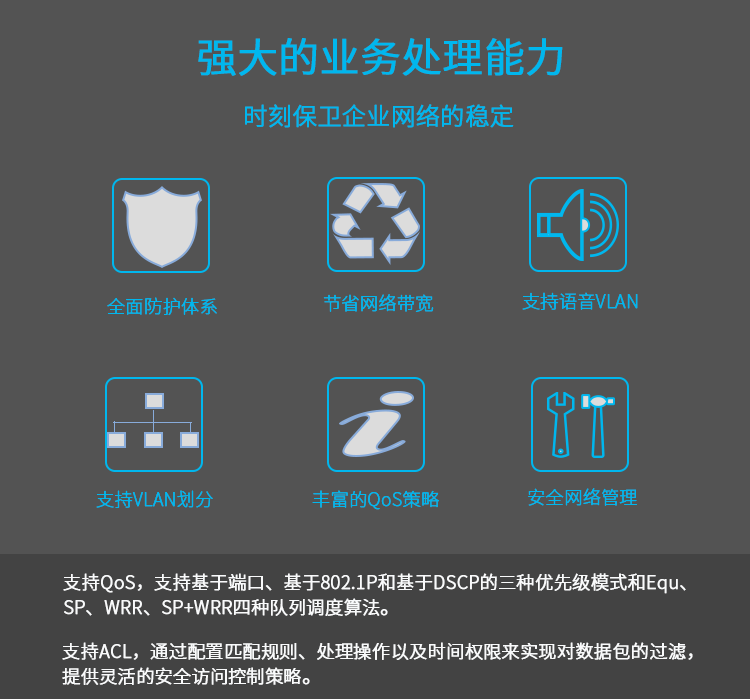全面防護體系、節省網絡帶寬、支持語音VLAN、支持VLAN劃分、豐富的QoS策略、安全網絡管理。