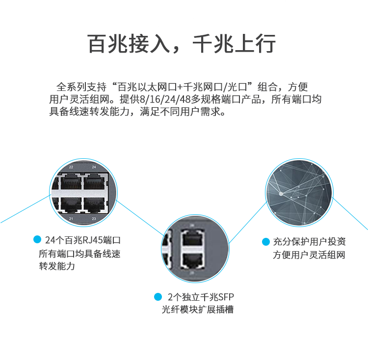 支持“百兆以太網口+千兆網口/光口”組合,方便用戶靈活組網。提供8/16/24/48多規格端口,所有端口均具備轉速能力,滿足不同用戶需求。