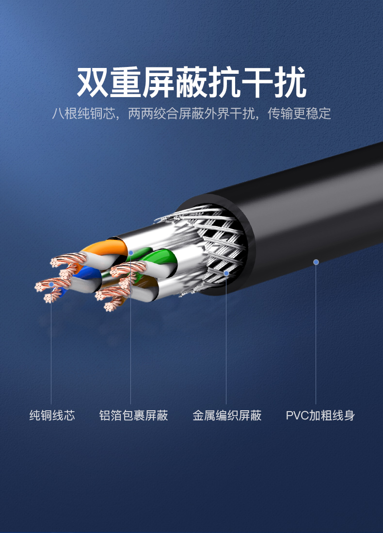 傳輸性能滿足并優于六類標準。完全支持千兆以太網應用,最高傳輸頻率350MHz,為未來應用提供額外帶寬。中心為十字骨架隔離設計,增強了帶寬和網絡性能。導體采用23AWG優質無氧銅線(99.99%);采用鋁箔總屏蔽結構,改善線纜外部串擾及衰減;線纜成軸包裝,保護結構穩定。